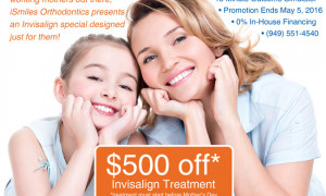 We love all of our patients and have witnessed the countless, dedicated parents who take the time to make sure their kids get the orthodontic care they deserve. Well, it's time for the Mothers to get special treatment as well! We have a specially designed Invisalign special just for the Moms. Call us at (949) 551-4540 to book your complimentary consultation which includes a 15 minute Outcome Simulator using our state-of-the-art iTero machine. We'll scan your teeth and then show you what they will look like after treatment. We're confident you'll be pleased with what you'll see. Book your first treatment before Mother's Day (May 8th) and you'll enjoy $500 off your entire treatment. Call us now to get started. No need to show proof that you're a mom.